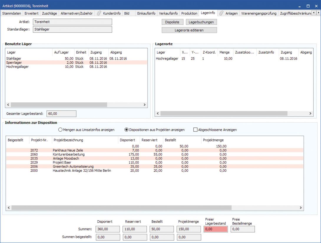 Die Lagerverwaltung gibt einen ständig aktuellen Überblick zum Bestand, zur disponierten, reservierten und bestellten Menge eines Artikel.